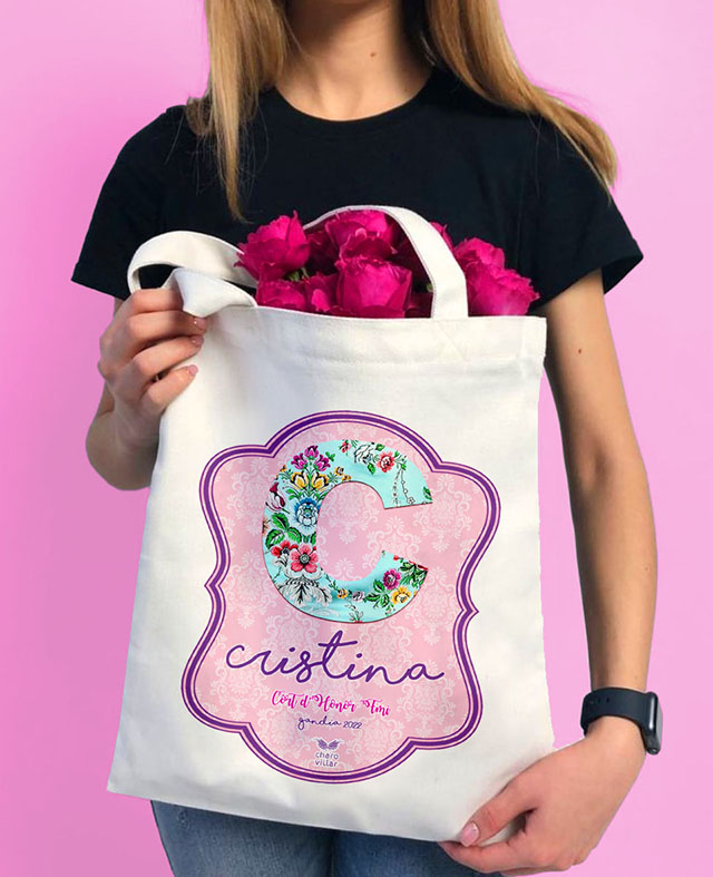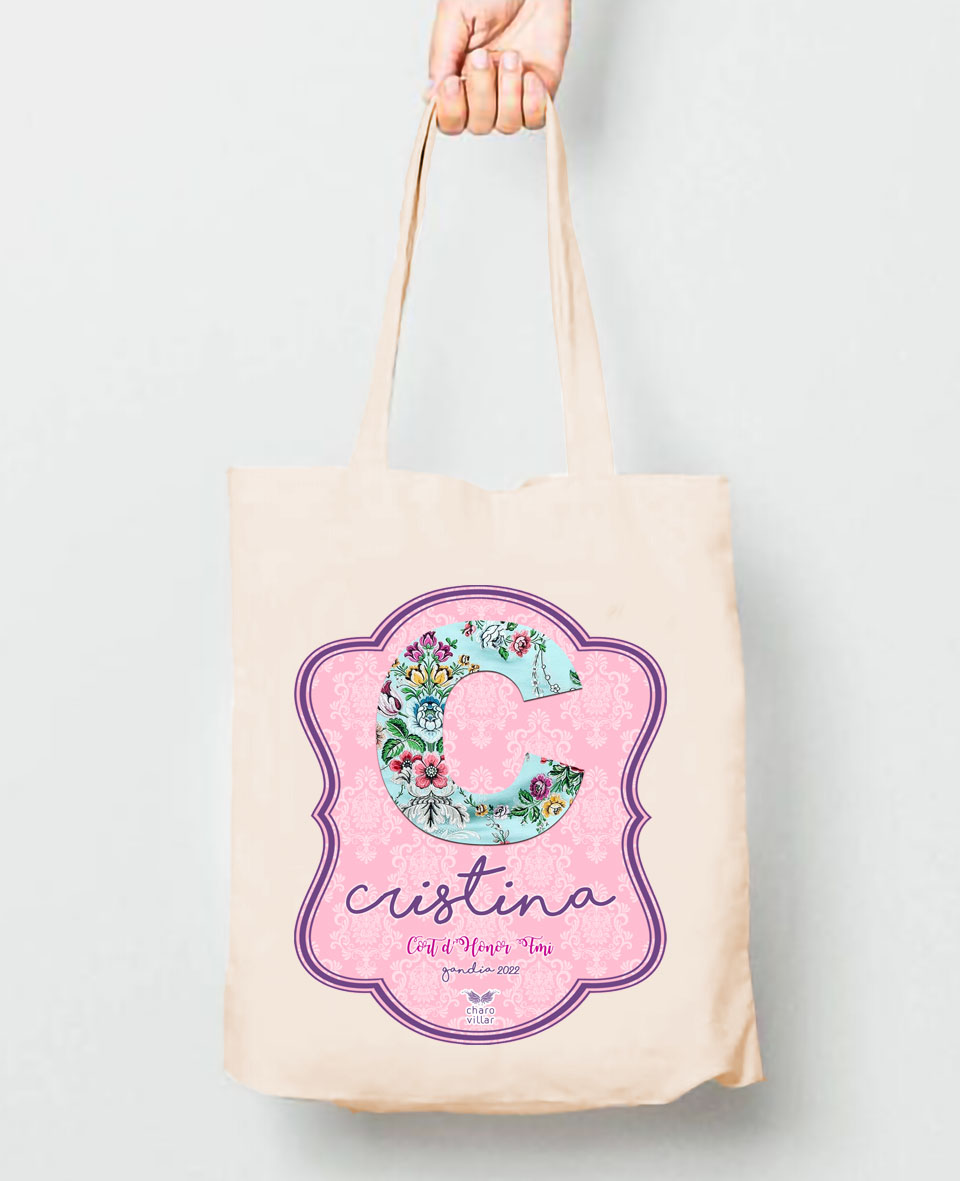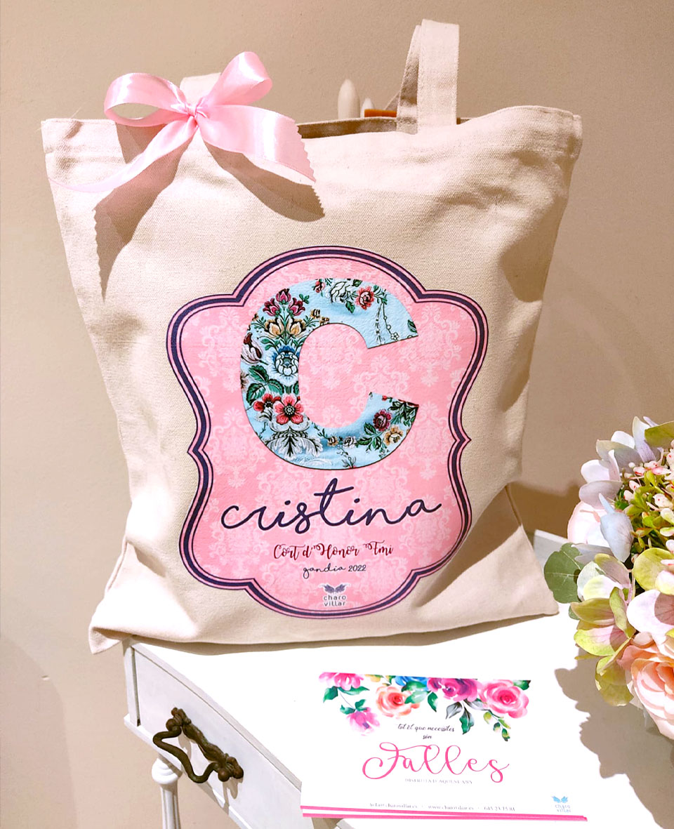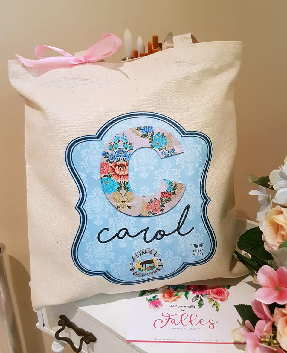 Bolsa fallera personalizada de algodón de alta calidad. Con inicial, nombre y cargo que representa.